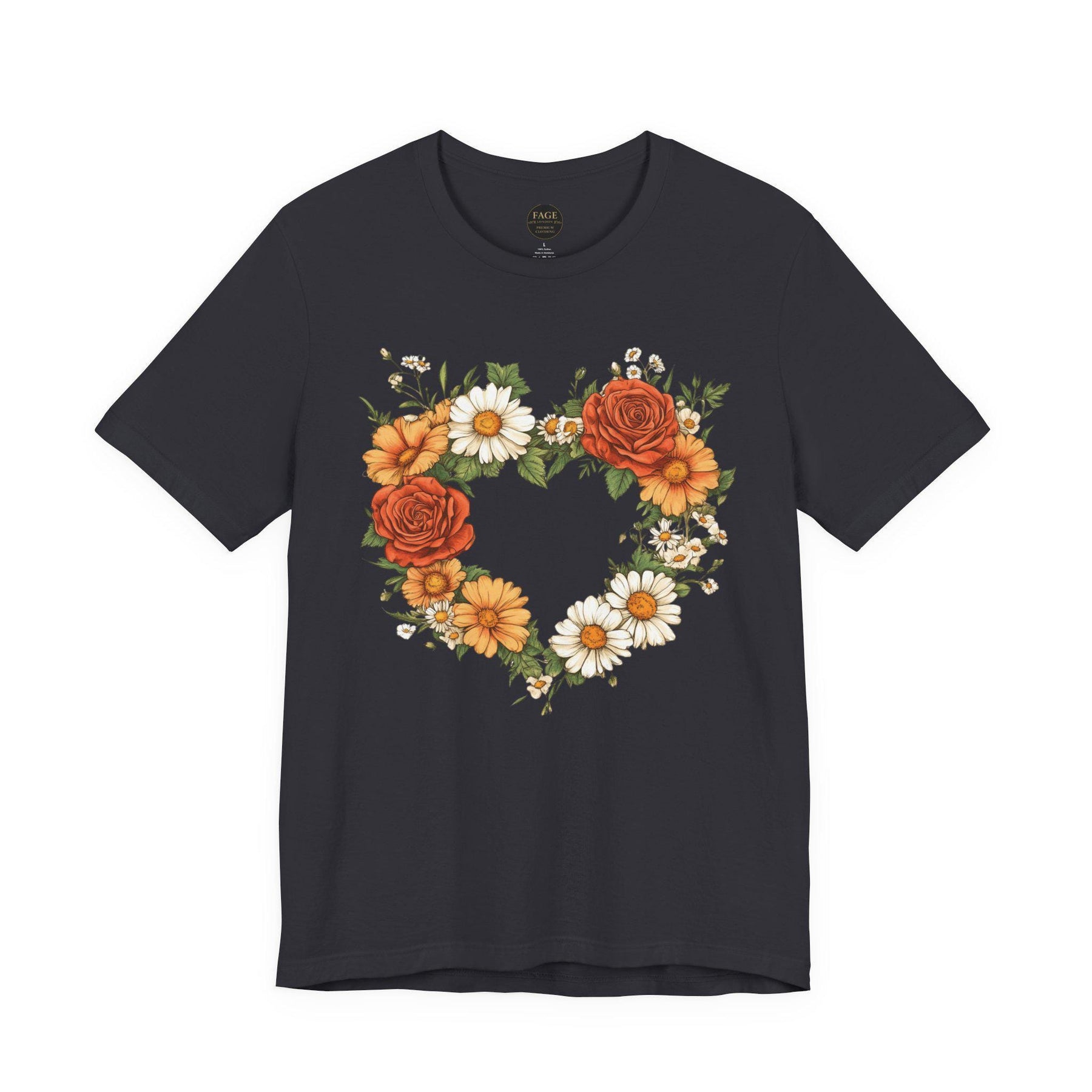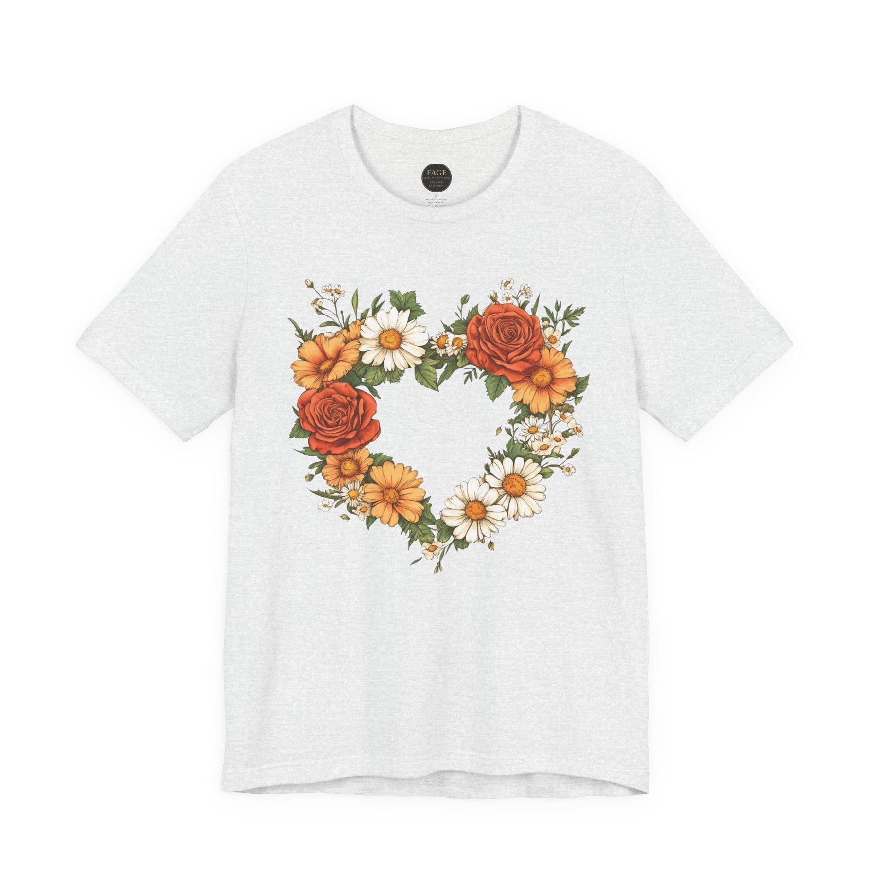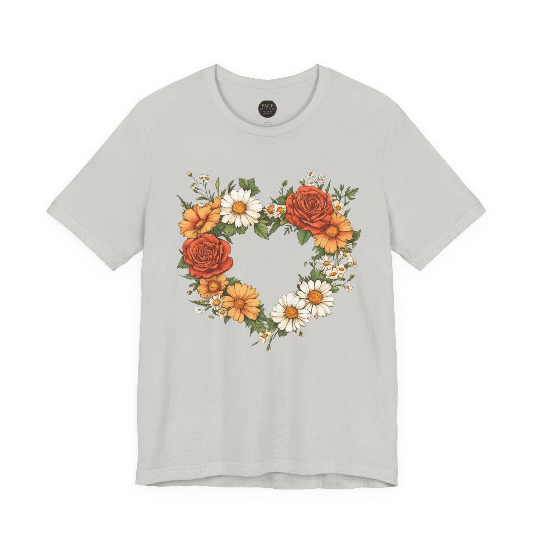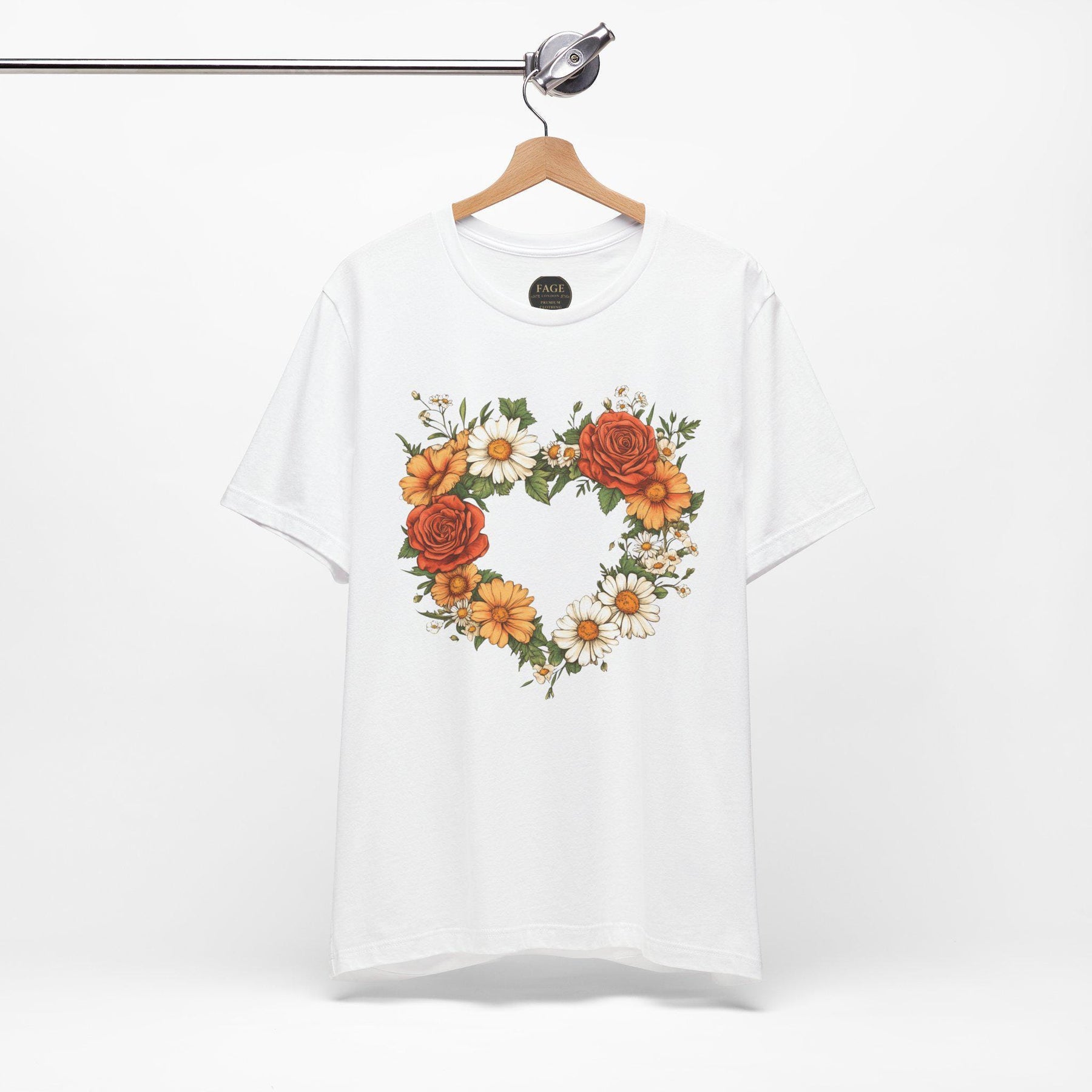 This lightweight crew-neck tee brings a cottage core touch to everyday wear with a delicate wildflower heart at its centre. A soft wreath of roses, daisies, and greenery forms a hand-drawn heart that reads like a found botanical sketch pinned to a garden gate. Wear it on slow mornings with a cardigan and tea, or layered under a denim jacket for market runs — it settles easily into a life that favours gentle rhythms, sunlit walks, and small, thoughtful moments. The breathable cotton and clean retail fit keep the silhouette simple so the floral motif remains the quiet centrepiece. For someone who collects wildflowers, journals about seasons, or decorates a home with woven baskets and linen napkins, this tee feels like a familiar postcard from the countryside.