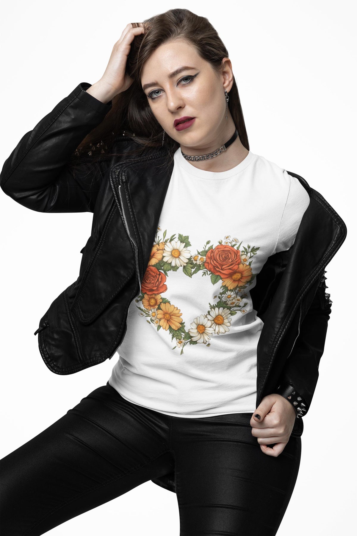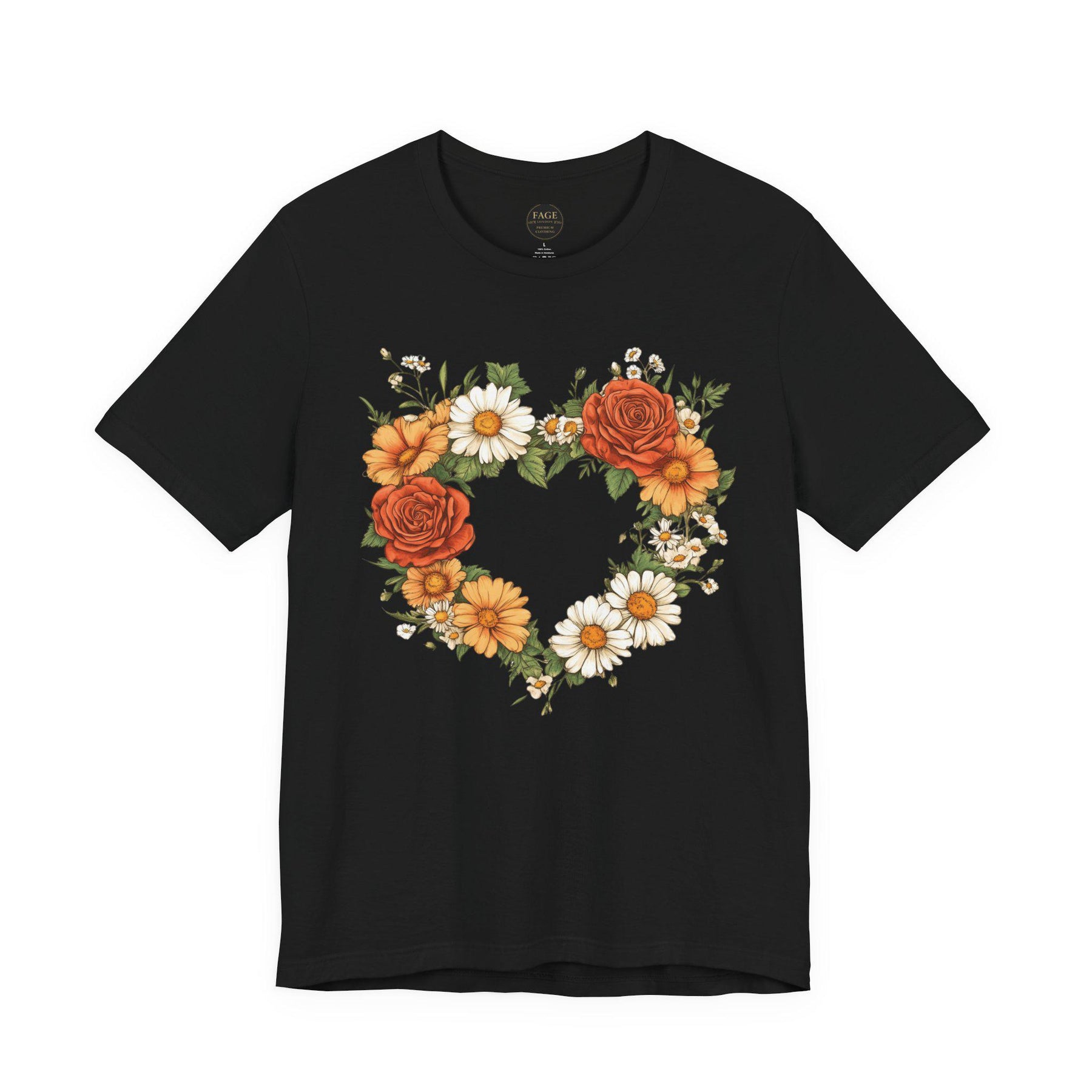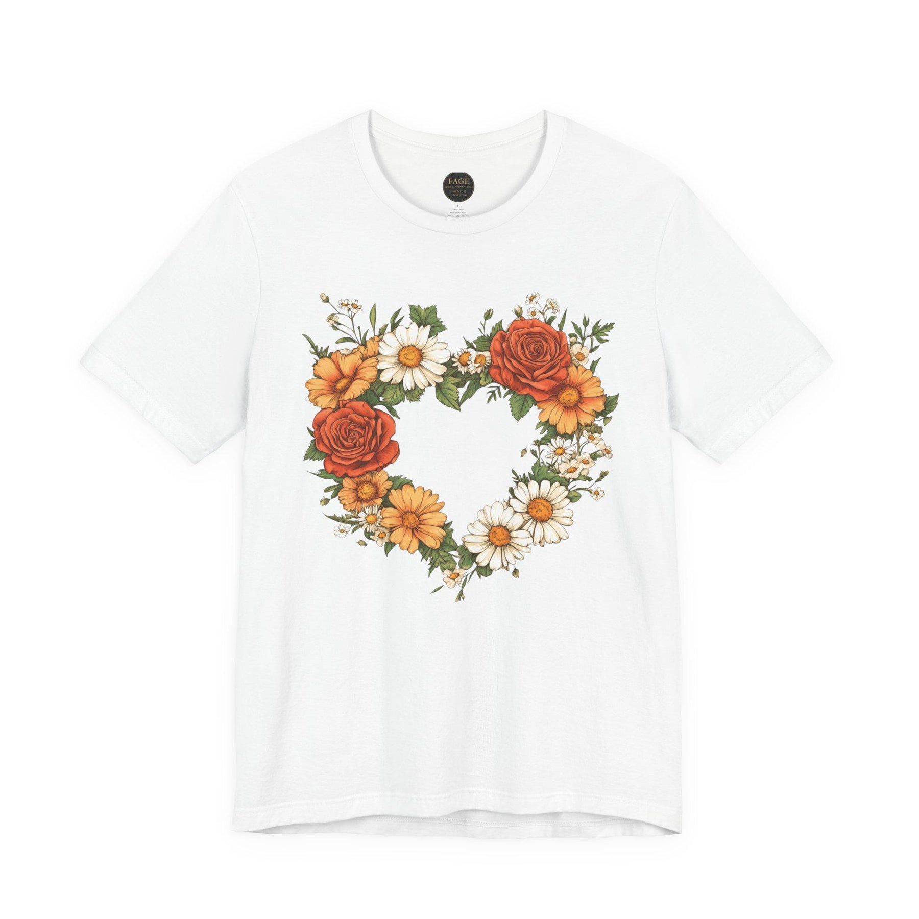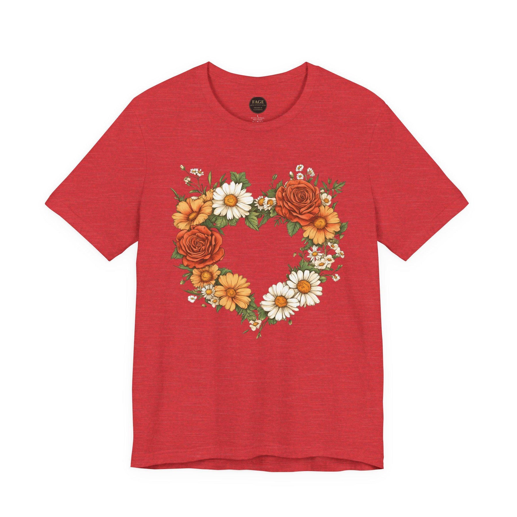 This lightweight crew-neck tee brings a cottage core touch to everyday wear with a delicate wildflower heart at its centre. A soft wreath of roses, daisies, and greenery forms a hand-drawn heart that reads like a found botanical sketch pinned to a garden gate. Wear it on slow mornings with a cardigan and tea, or layered under a denim jacket for market runs — it settles easily into a life that favours gentle rhythms, sunlit walks, and small, thoughtful moments. The breathable cotton and clean retail fit keep the silhouette simple so the floral motif remains the quiet centrepiece. For someone who collects wildflowers, journals about seasons, or decorates a home with woven baskets and linen napkins, this tee feels like a familiar postcard from the countryside.