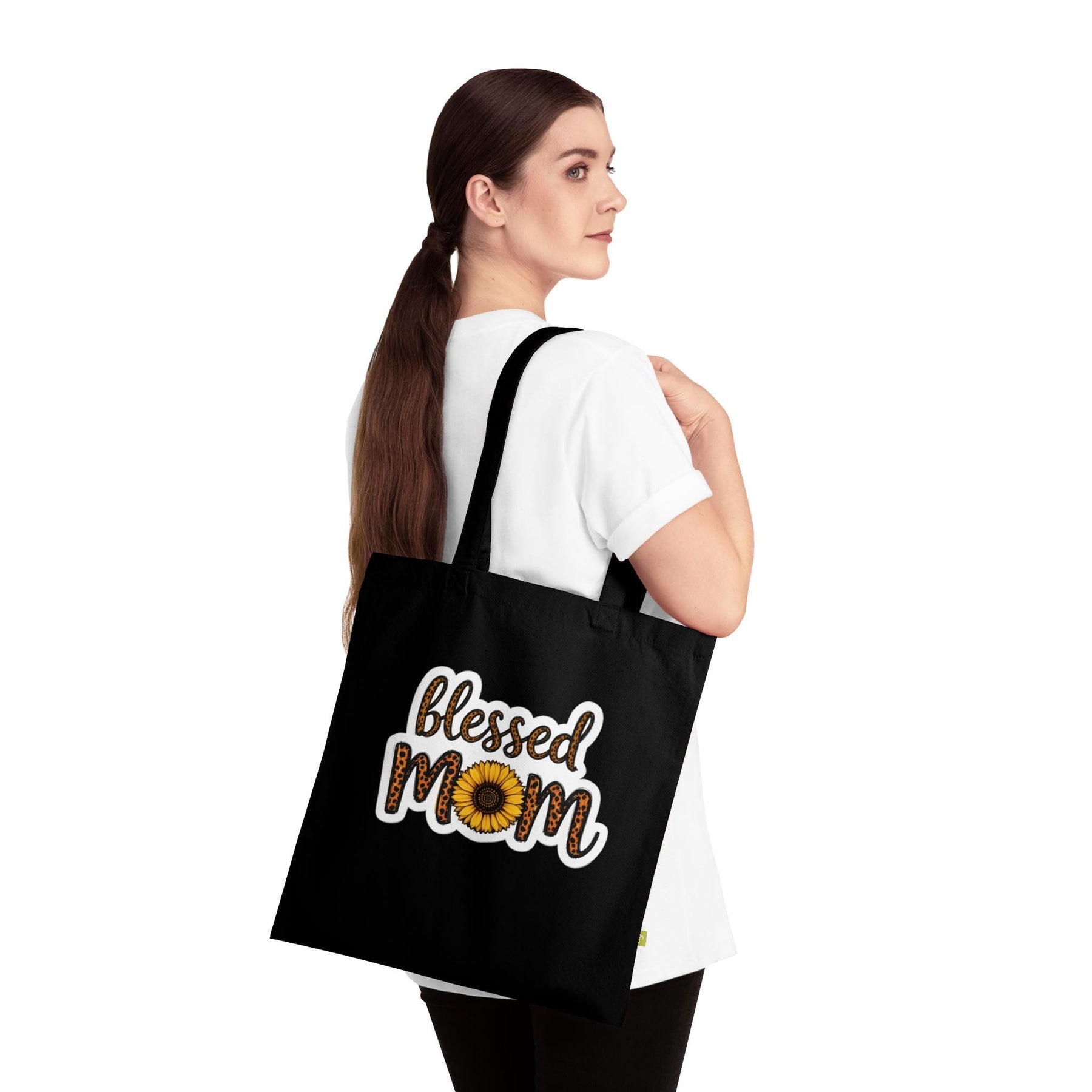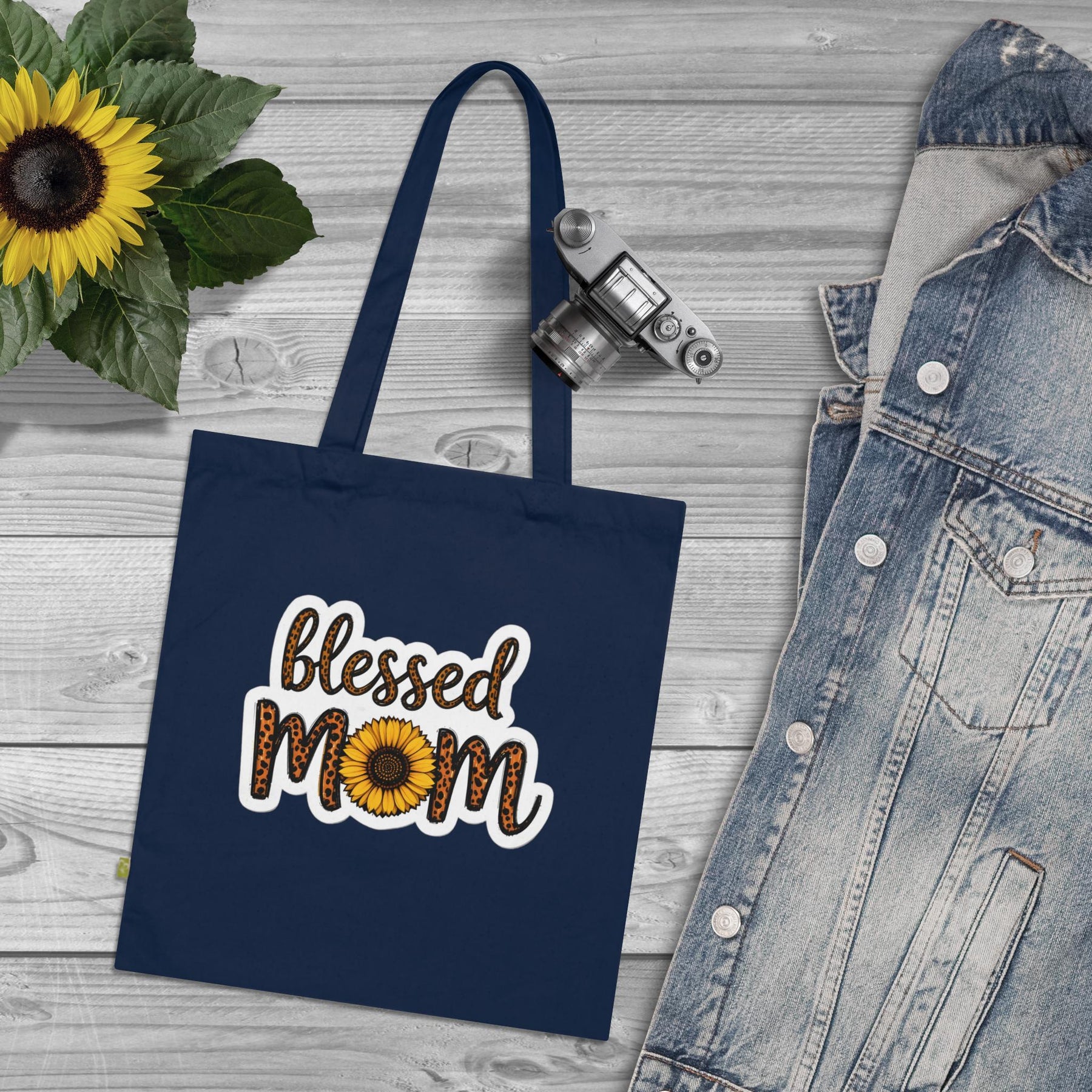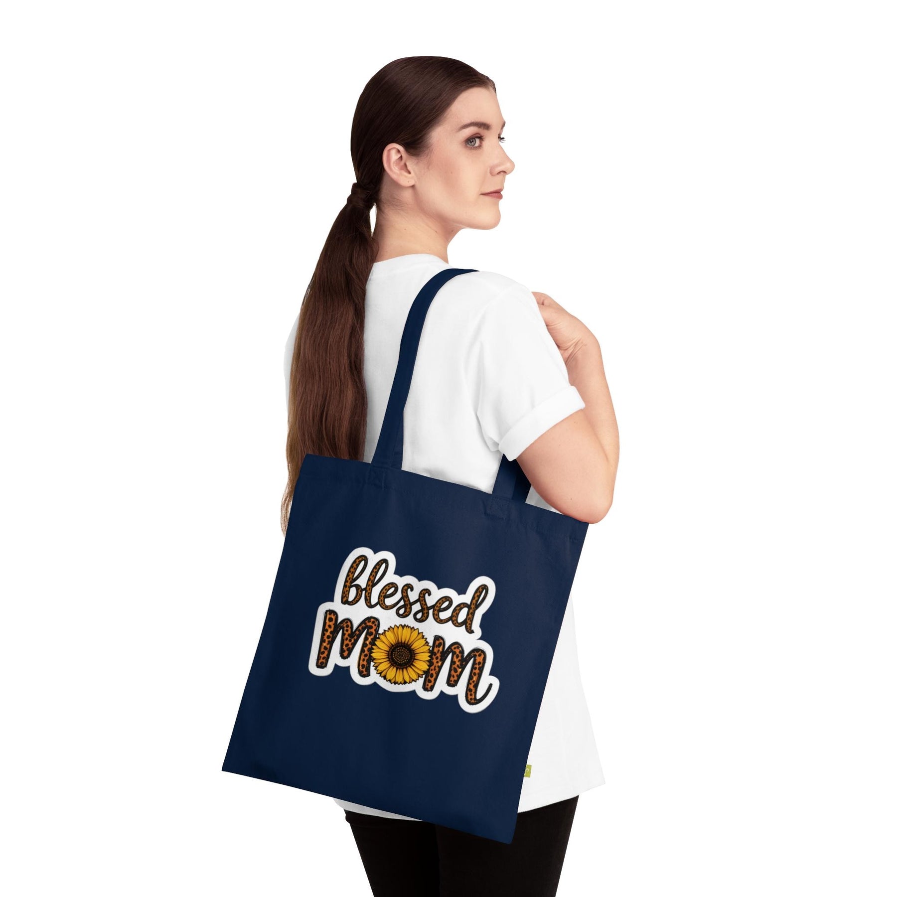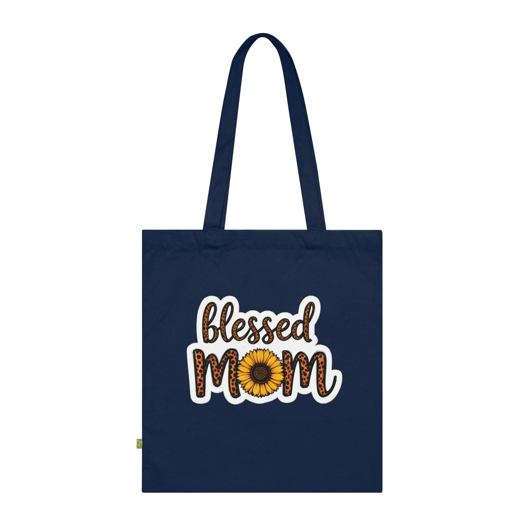 Fold it over your shoulder and go — this navy organic cotton tote carries more than groceries. A warm sunflower and leopard-accented “Blessed Mom” design sits bold against deep navy, the kind of bag that shows up to school pick-up, market runs, or a weekend of errands with quiet confidence. The heavy organic canvas holds its shape and weight, while reinforced handles and flat-corner construction mean the bag stays steady whether it’s full of library books or a farmer’s-market haul. It feels lived-in from day one: substantial under the hand, simple in its lines, and unmistakably personal — a small, everyday reminder of family, humour, and the little bright things that keep you going.